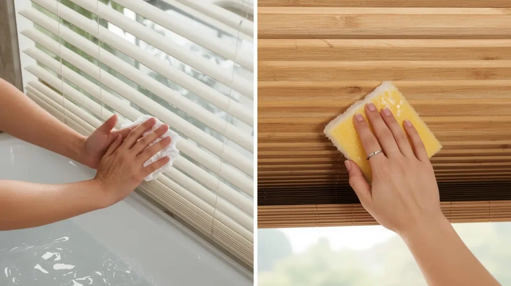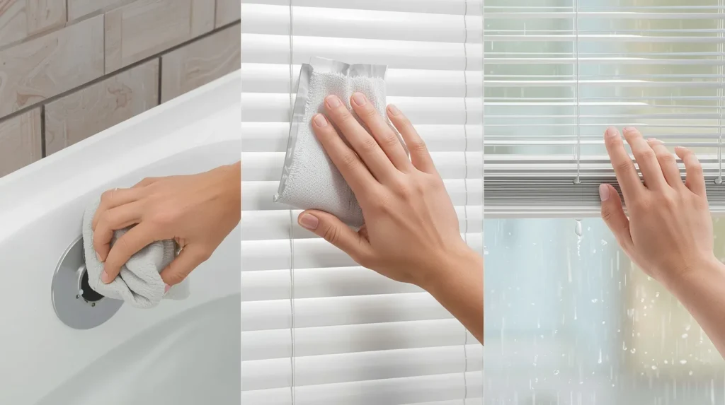 Each material needs special care. Vinyl blinds are durable and soak well in the tub. Plastic blinds can also be washed, but avoid harsh scrubbing to prevent scratches. Aluminum blinds are lightweight and may bend if handled roughly, so use a soft sponge and rinse gently. For all three, soaking blinds in tub water helps lift dirt quickly. After rinsing, make sure blinds are dried properly to stop water spots. Cleaning vinyl blinds in bathtub water is often the easiest, while aluminum blinds need a little more patience.